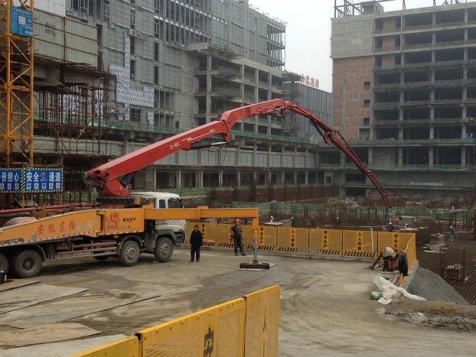 合肥綠地中央廣場位于高鐵路與廬州大道交口,高鐵南站旁。該項目由合肥建工集團承建,其中塔樓D建筑高度為200m,底板砼強度為C45P8,12000立方砼一次性連續(xù)澆筑,我公司48小時完成該項目12000方砼連續(xù)澆筑。該部位砼難點在于水化熱的控制,因為設(shè)計強度高(C45),底板核心筒位置厚度達9m。經(jīng)過我公司技術(shù)團隊的精心設(shè)計,優(yōu)化配合比,采用優(yōu)質(zhì)粉煤灰.礦渣粉雙摻,降低水泥用量等技術(shù)措施,該項目底板沒有出現(xiàn)裂縫。經(jīng)過長達15天的溫度監(jiān)測,砼中心溫升未超過60攝氏度,溫差未超過25攝氏度,該部位施工完美結(jié)束。