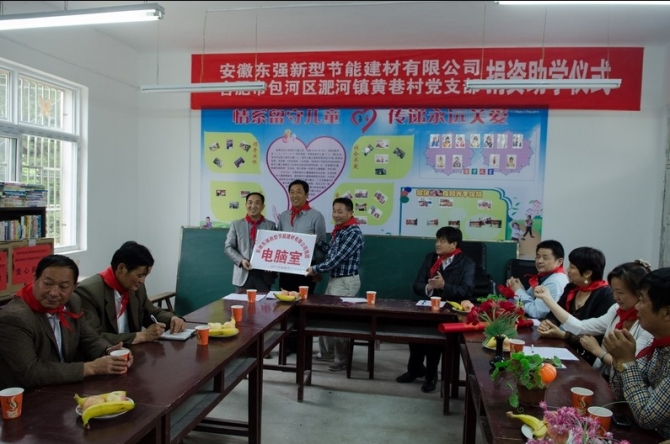 在捐資儀式上,董事長(zhǎng)倪修倫親手將十臺(tái)價(jià)值三萬(wàn)余元電腦,交給了涼亭小學(xué)校長(zhǎng)手上。董事長(zhǎng)說(shuō),作為一個(gè)成熟的企業(yè)來(lái)說(shuō),有責(zé)任關(guān)愛(ài)山區(qū)的教育事業(yè),今天的捐贈(zèng)活動(dòng)是關(guān)愛(ài)山區(qū)教育事業(yè)的第一步,今后要把關(guān)愛(ài)行動(dòng)持續(xù)下去??偨?jīng)理深情的說(shuō),今天回到家鄉(xiāng),回到母校,倍感親切,我懷著感恩的心,報(bào)答家鄉(xiāng),報(bào)答母校。合肥市包河區(qū)淝河鎮(zhèn)黃巷村黨總支也向涼亭小學(xué)捐贈(zèng)了電腦操作臺(tái),書(shū)記黃帥在捐贈(zèng)儀式上作了講話。