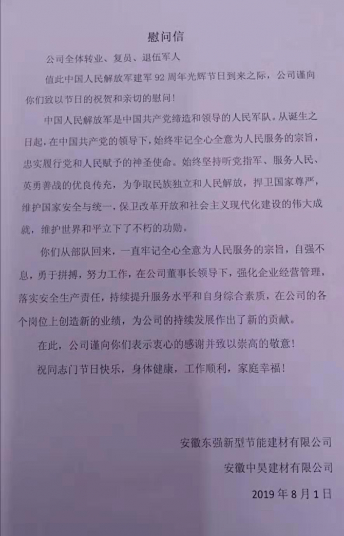 2019年8月1日迎來中國人民解放軍建軍92周年,公司全體領(lǐng)導、員工,向祖國最親愛的子弟兵致以衷心的祝福,同時向公司退伍軍人表達親切的慰問。